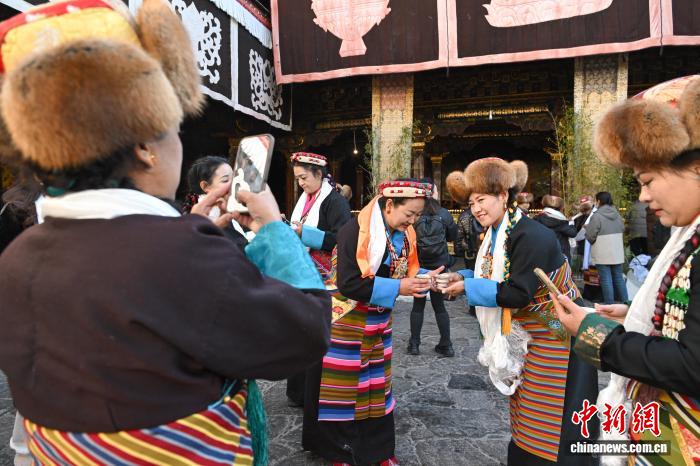 隨著藏歷十月十五白拉姆節(jié)(又稱“仙女節(jié)”)臨近,11月28日,西藏拉薩的婦女們在大昭寺互敬青稞酒,迎接“仙女節(jié)”到來?!跋膳?jié)”即吉祥天母節(jié),藏語稱“白來日追”。相傳藏傳佛教最高護法神之一班丹拉姆的女兒白拉姆,不顧母親的反對與赤尊贊私定終身,班丹拉姆一怒之下將赤尊贊趕到拉薩河南岸,規(guī)定二人僅每年的藏歷十月十五日相見。中新社記者 貢嘎來松 攝