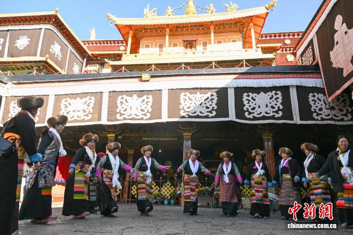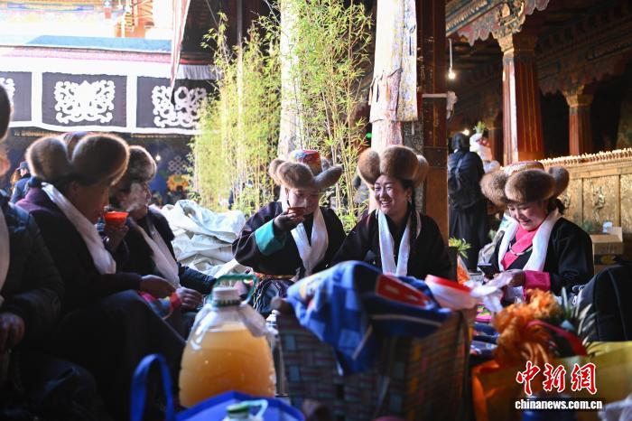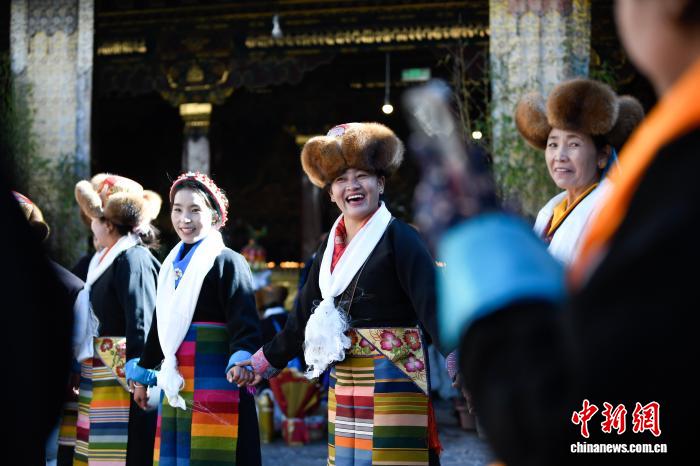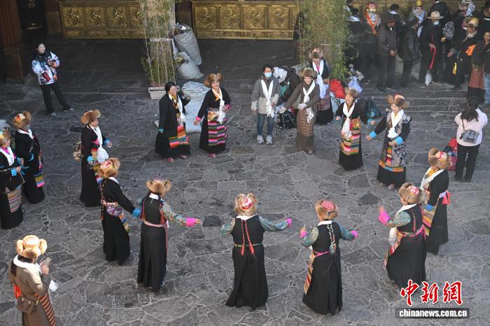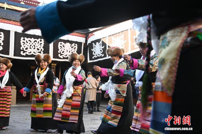 隨著藏歷十月十五白拉姆節(jié)(又稱“仙女節(jié)”)臨近,11月28日,西藏拉薩的婦女們在大昭寺跳完傳統(tǒng)舞蹈后休息,迎接“仙女節(jié)”到來。“仙女節(jié)”即吉祥天母節(jié),藏語稱“白來日追”。相傳藏傳佛教最高護法神之一班丹拉姆的女兒白拉姆,不顧母親的反對與赤尊贊私定終身,班丹拉姆一怒之下將赤尊贊趕到拉薩河南岸,規(guī)定二人僅每年的藏歷十月十五日相見。中新社記者 貢嘎來松 攝