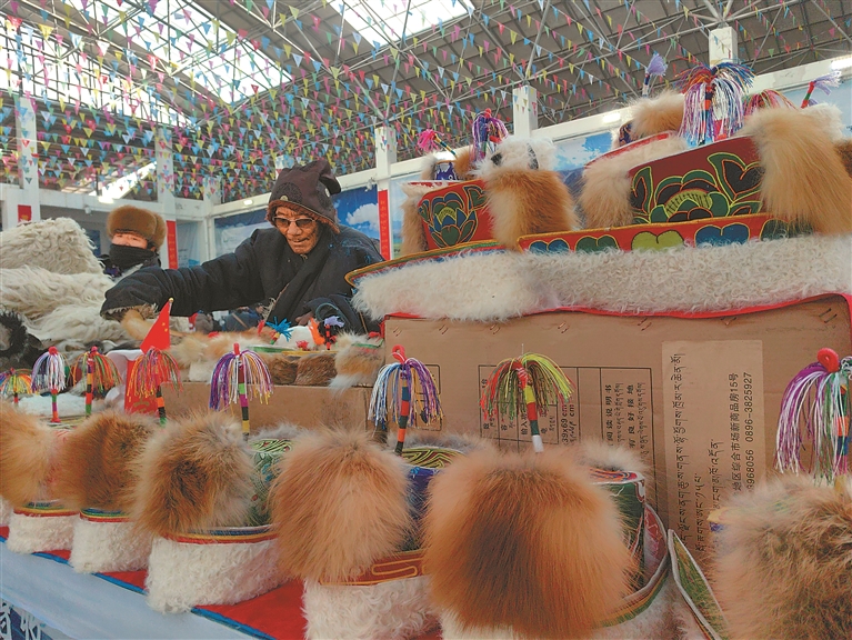 圖為那曲市安多縣牧民在整理銷售天線帽工藝品。記者 趙書彬 攝