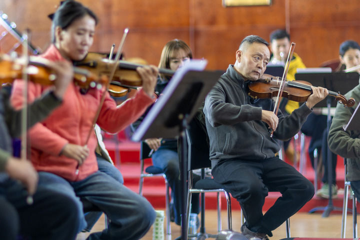 西藏自治區(qū)歌舞團小提琴演奏家羅雪萊(右)在進行排練(2025年11月3日攝)。新華社記者 姜帆 攝