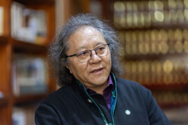 藏族音樂家覺嘎在家中與客人談論音樂理念(2025年11月4日攝)。新華社記者 姜帆 攝