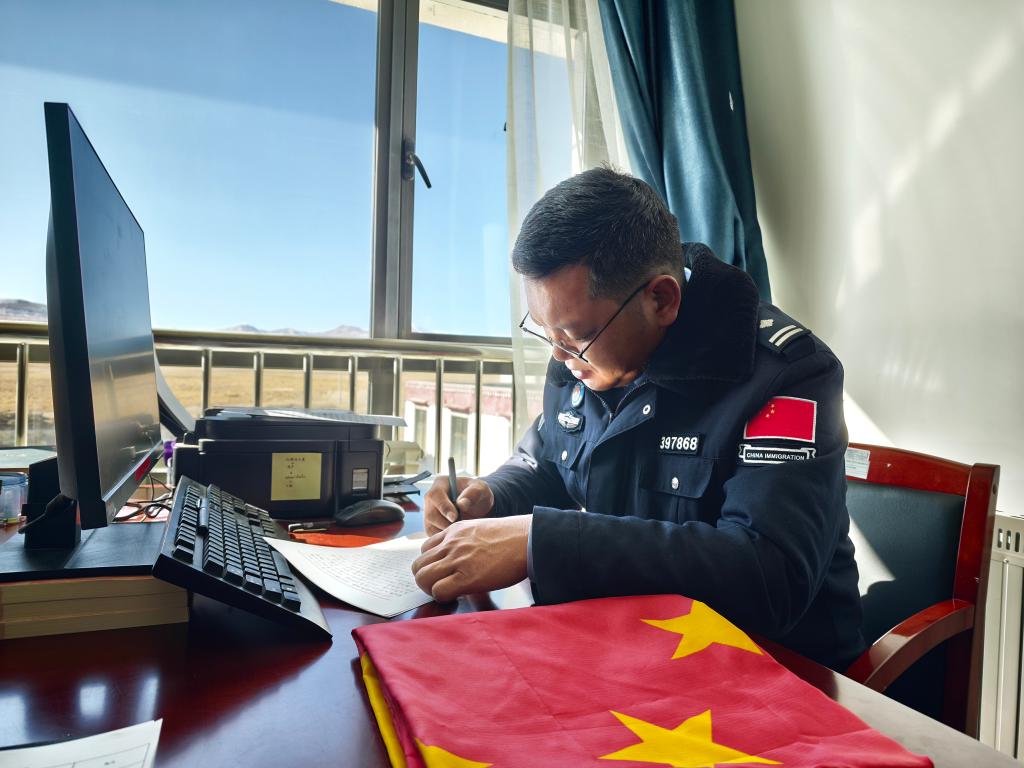 普瑪江塘邊境派出所所長(zhǎng)普布扎西為海南大學(xué)愛心藝術(shù)團(tuán)回信。(普瑪江塘邊境派出所供圖)
