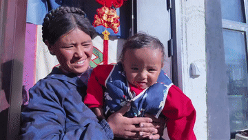 次仁拉姆在剛交付的新居前懷抱女兒格桑巴宗(2025年10月24日攝)。新華社記者 姜帆 攝