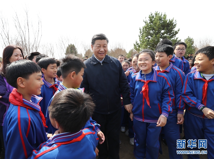 4月8日,黨和國(guó)家領(lǐng)導(dǎo)人習(xí)近平、栗戰(zhàn)書、汪洋、王滬寧、趙樂(lè)際、韓正、王岐山等來(lái)到北京市通州區(qū)永順鎮(zhèn)參加首都義務(wù)植樹活動(dòng)。這是習(xí)近平同少先隊(duì)員在一起。新華社記者鞠鵬 攝