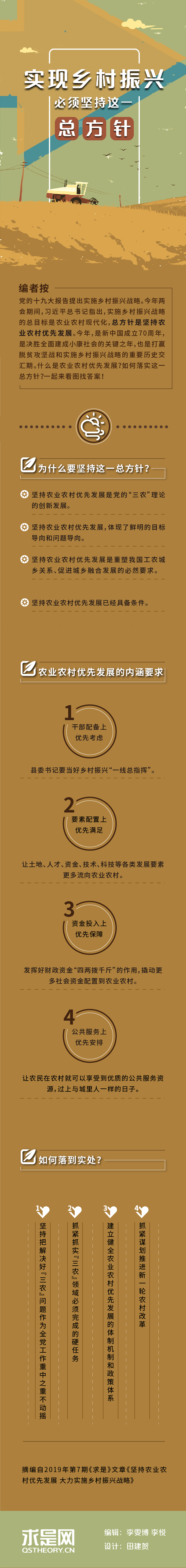 編者按:黨的十九大報告提出實施鄉(xiāng)村振興戰(zhàn)略。今年兩會期間,習(xí)近平總書記指出,實施鄉(xiāng)村振興戰(zhàn)略的總目標是農(nóng)業(yè)農(nóng)村現(xiàn)代化,總方針是堅持農(nóng)業(yè)農(nóng)村優(yōu)先發(fā)展。今年,是新中國成立70周年,是決勝全面建成小康社會的關(guān)鍵之年,也是打贏脫貧攻堅戰(zhàn)和實施鄉(xiāng)村振興戰(zhàn)略的重要歷史交匯期。什么是農(nóng)業(yè)農(nóng)村優(yōu)先發(fā)展?如何落實這一總方針?一起來看圖找答案!
