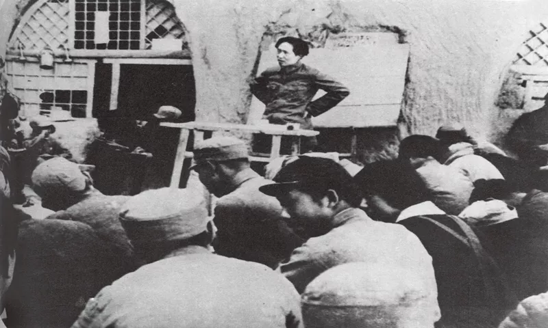 毛澤東非常重視理論聯系實際這一馬克思主義學風的養(yǎng)成,強調必須始終堅持把馬克思主義與中國實際緊密結合起來。圖為毛澤東在為陜北公學學員講課。