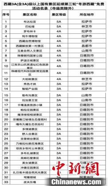 此次“冬游西藏”對外免費游覽景區(qū)共33家,均為西藏國有3A(含3A)級以上景區(qū)。其中5A級景區(qū)2家,4A級景區(qū)10家。(景區(qū)名錄見下圖)