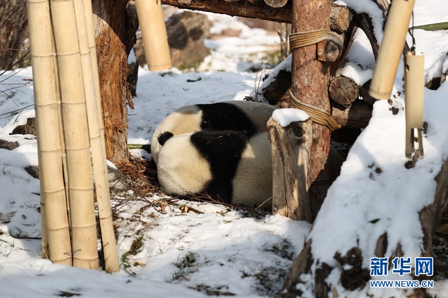 11月21日,西寧市熊貓館兩只大熊貓?jiān)凇按蝽飪骸?。新華社記者 吳剛 攝