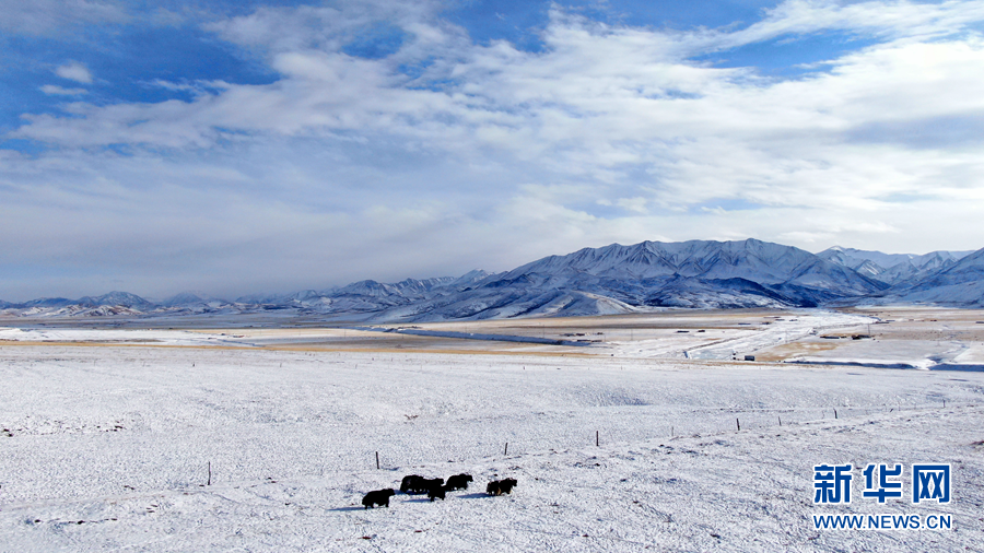 12月6日,牦牛在雪后的阿柔草原上活動(無人機照片)。新華社記者 張宏祥 攝