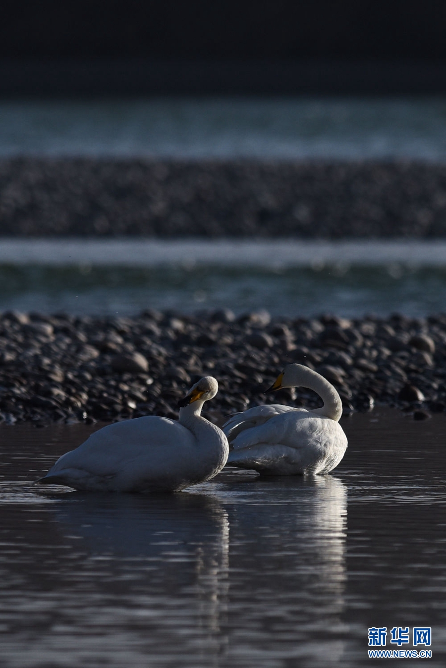 12月11日,幾只大天鵝在青海省貴德縣境內的黃河里嬉戲。新華社記者 吳剛 攝