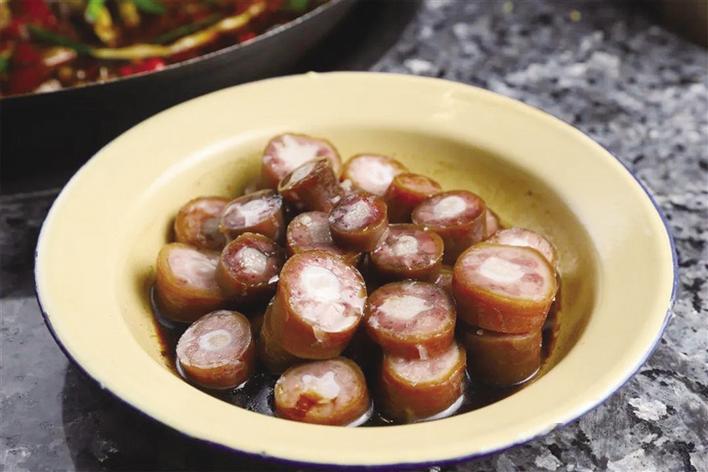 12月9日晚,記者和品鑒團(tuán)成員們來(lái)到外婆怪味雞餐廳。走進(jìn)店內(nèi),一股懷舊風(fēng)撲面而來(lái)——擺滿食材的木架、古式的燈罩、茅草屋、實(shí)木桌椅,讓人仿佛置身于農(nóng)家小院。該餐廳就餐區(qū)分為一樓大廳食材展示區(qū)、二樓大廳用餐區(qū)以及包間區(qū),每層樓都各有特色,環(huán)境十分雅致?!胺浅O矚g這家店的裝修風(fēng)格,店里布置的實(shí)木亭、老式電視、音箱以及那些高高掛起的腌臘肉都讓我感覺非常親切,也讓我想起了小時(shí)候在四川老家生活的時(shí)光?!逼疯b團(tuán)成員李女士說(shuō)。