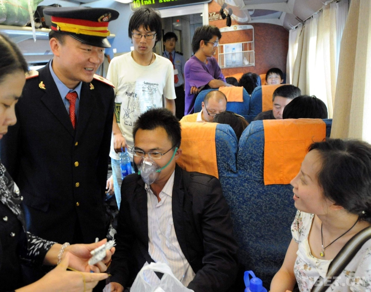 這是夫妻同在京藏列車上工作、被人們親切稱為“高飛的比翼鳥”的京藏車隊(duì)十一組列車長王寶山為身體不適的旅客送上氧氣面罩(唐召明2010年8月22日攝)
