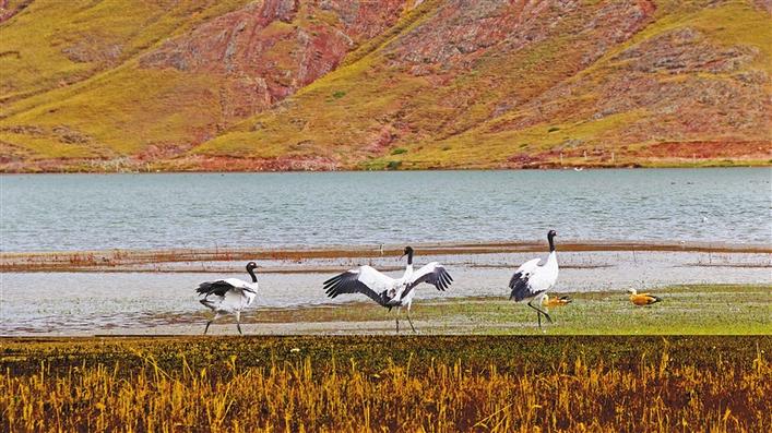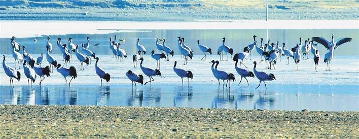 在冬日暖陽(yáng)的照耀下,成群結(jié)隊(duì)的鳥(niǎo)兒在河面上、濕地里盡情嬉戲,赤麻鴨悠然戲水、斑頭雁低聲吟唱、黑頸鶴翩翩起舞……一派熱鬧的景象。