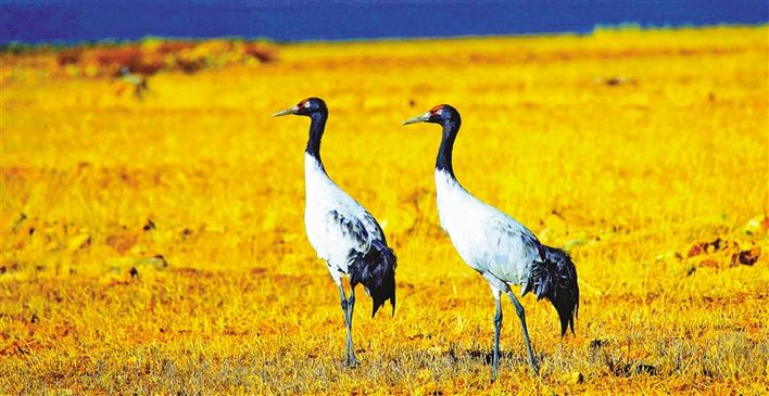 一對(duì)黑頸鶴在林周過(guò)冬。