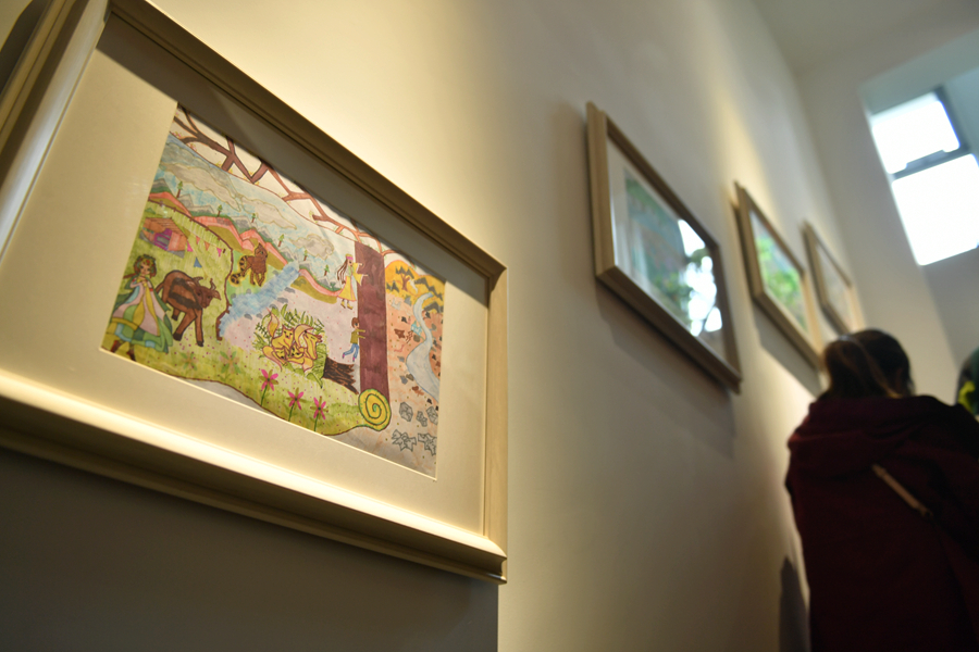 圖為祁連山國家公園青海片區(qū)展陳中心內(nèi)展出的兒童繪畫作品。