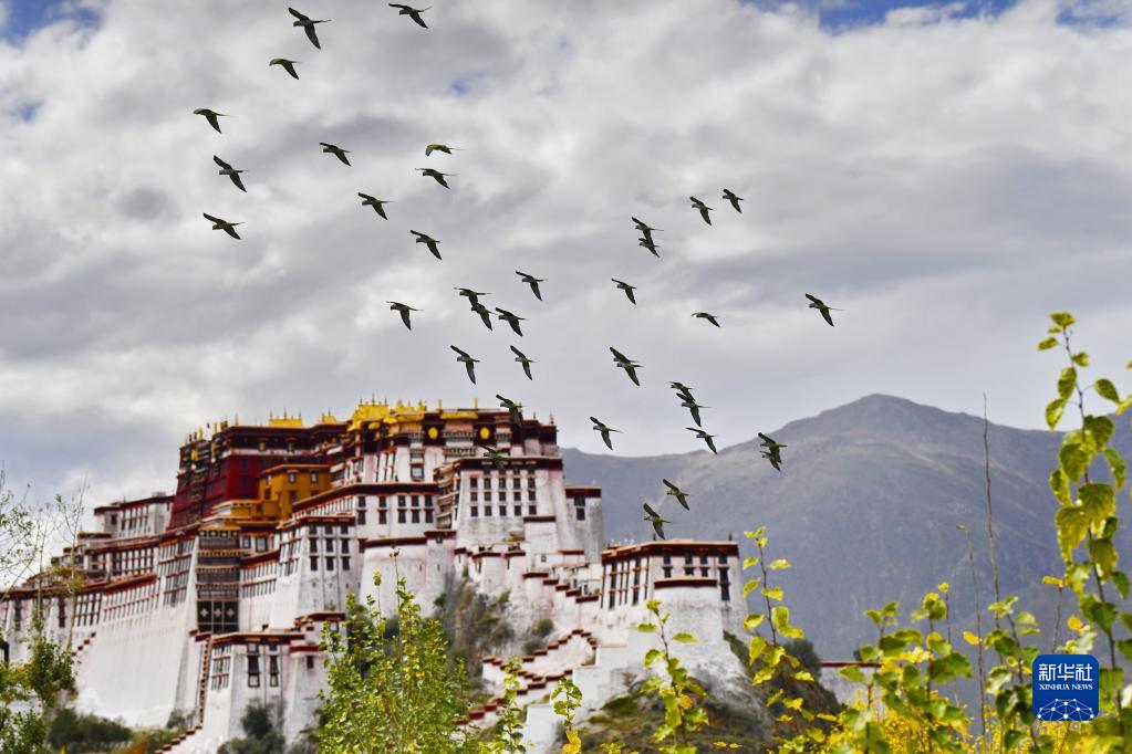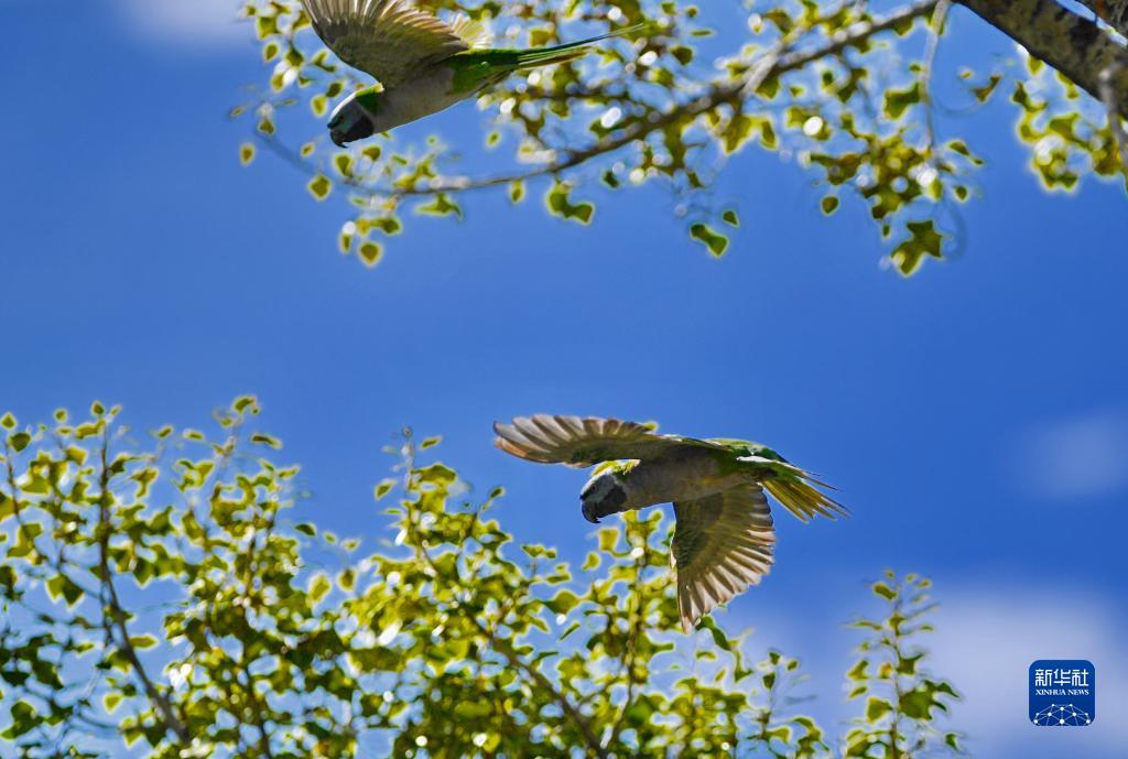 在拉薩市,大紫胸鸚鵡飛離枝頭(10月9日攝)。新華社記者 張汝鋒 攝