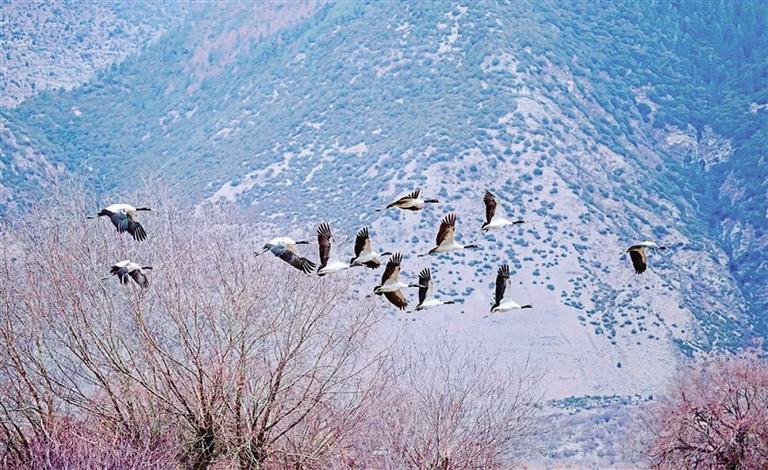 黑頸鶴是世界上唯一生長、繁殖在高原的鶴類,通?;顒佑诤0?000米以上的開闊農(nóng)田、河谷和濕地,屬國家一級保護動物,林芝是黑頸鶴的重要棲息地之一。據(jù)北京林業(yè)大學(xué)郭玉民教授團隊跟蹤監(jiān)測,10月30日以來,今年首批黑頸鶴順利從青海湖附近繁殖地返回林芝越冬地,遷徙直線距離超過1100公里。