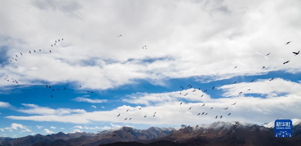 黑頸鶴群飛過林周縣強嘎鄉(xiāng)境內(nèi)山梁(11月6日攝)。新華社記者 姜帆 攝
