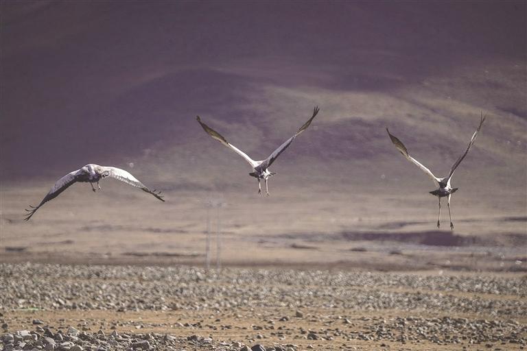 在西藏,黑頸鶴從越冬地到繁殖地有兩條線路:一條是拉薩到色林措,另一條則是從日喀則到色林措。整體來(lái)說(shuō),是從雅魯藏布江中游河谷黑頸鶴國(guó)家級(jí)自然保護(hù)區(qū)飛往色林措黑頸鶴保護(hù)區(qū),兩個(gè)保護(hù)區(qū)之間有一條固定的黑頸鶴遷徙路線,每年黑頸鶴會(huì)在3月中旬從越冬地雅江中游河谷及其支流拉薩河、年楚河流域的“一江兩河”地區(qū),飛去羌塘北部草原繁育后代;又會(huì)于11月中旬從繁殖地那曲的班戈縣、申扎縣、嘉黎縣,阿里的日土縣、普蘭縣,日喀則的昂仁縣,拉薩的當(dāng)雄縣返回到越冬地。對(duì)于雅江中游河谷來(lái)說(shuō),它是冬候鳥(niǎo);對(duì)于羌塘北部草原來(lái)說(shuō),它是夏候鳥(niǎo)。