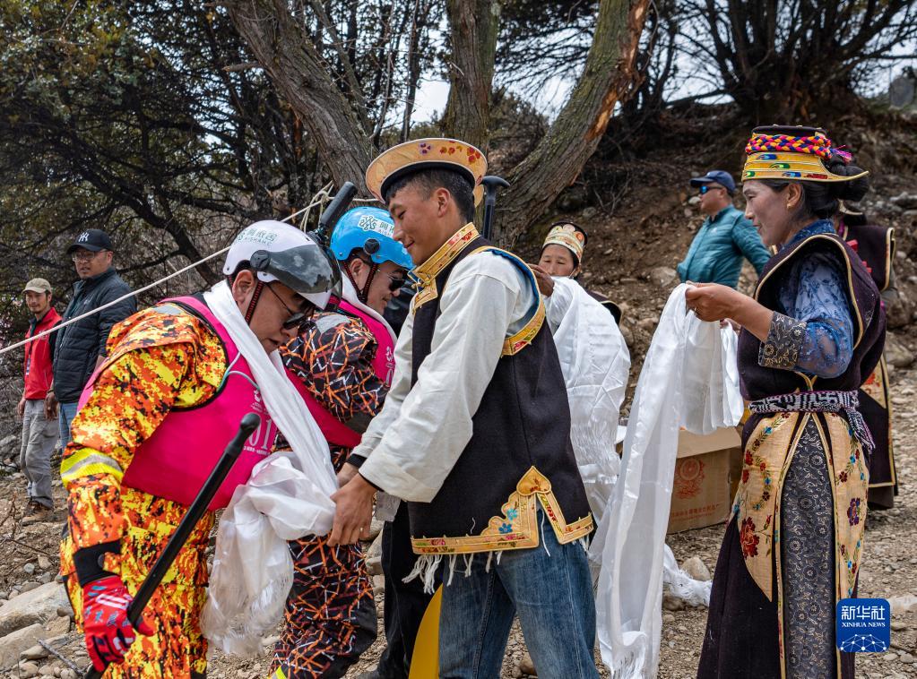 4月16日,激流漂流筏繞標(biāo)賽后,當(dāng)?shù)厝罕娊o完賽運(yùn)動(dòng)員獻(xiàn)上哈達(dá)。新華社記者 孫非 攝