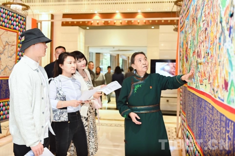 圖為格日勒老人(右)向嘉賓介紹“倉(cāng)央嘉措馬鬃繞線長(zhǎng)卷故事唐卡”