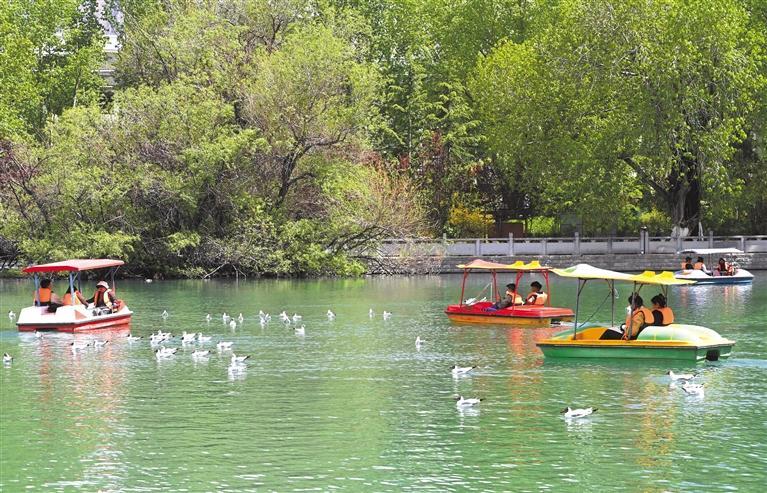 立夏時(shí)節(jié),拉薩處處綠樹(shù)成蔭、鳥(niǎo)語(yǔ)花香。宗角祿康公園樹(shù)木郁郁蔥蔥、湖水清澈見(jiàn)底,成為市民和游客游玩、休閑的好去處。 圖為市民和游客在宗角祿康公園乘船游玩。記者 洛桑 攝