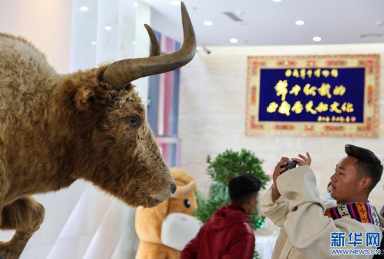一名學(xué)生在西藏牦牛博物館拍攝展出的金絲野牦牛標(biāo)本(5月18日攝)。新華社記者 姜帆 攝