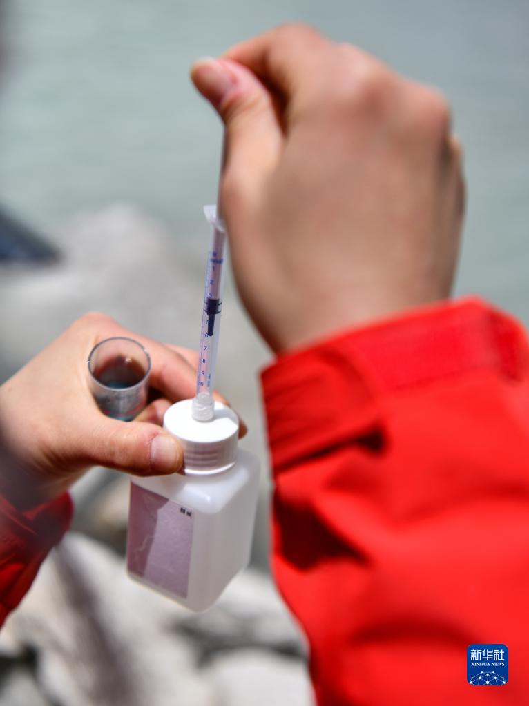 在珠峰登山大本營附近,來自西藏大學(xué)生態(tài)環(huán)境學(xué)院的科考隊(duì)員在收集水生生物樣本(5月22日攝)。新華社記者 孫非 攝