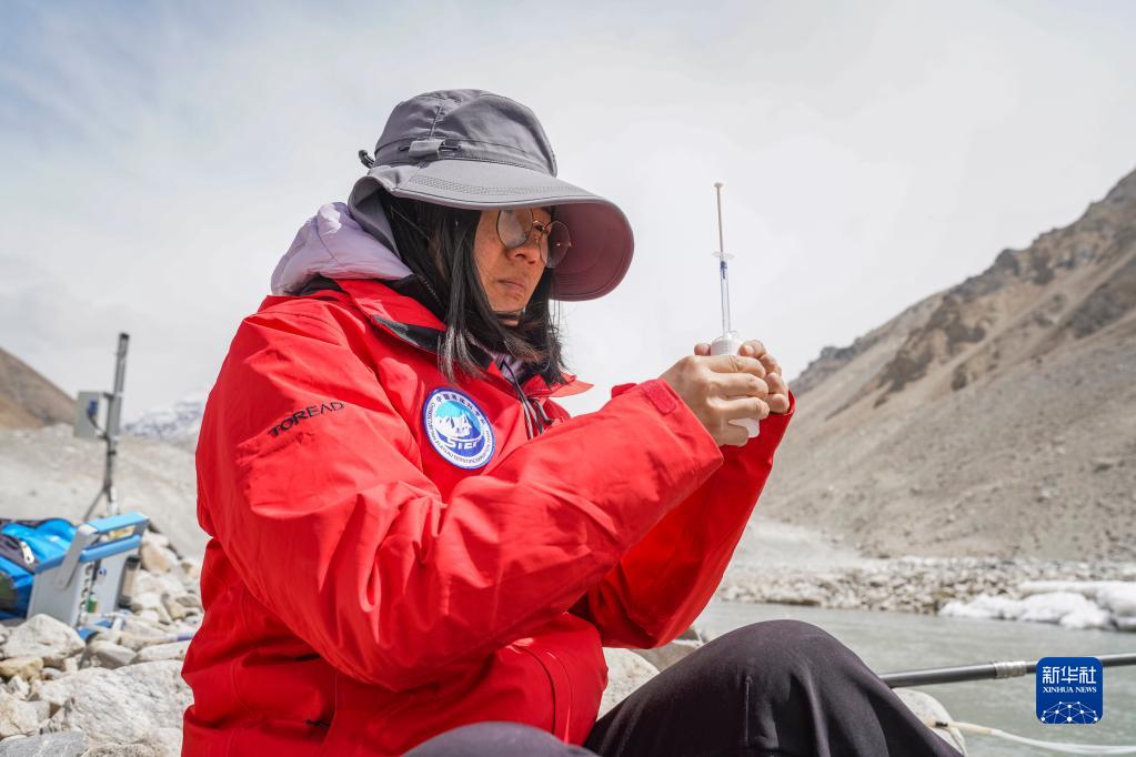 在珠峰登山大本營附近,來自中國科學(xué)院青藏高原研究所的科考隊(duì)員邱海英在檢測(cè)絨布冰川末端水質(zhì)(5月14日攝)。新華社記者 孫非 攝