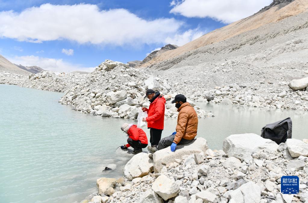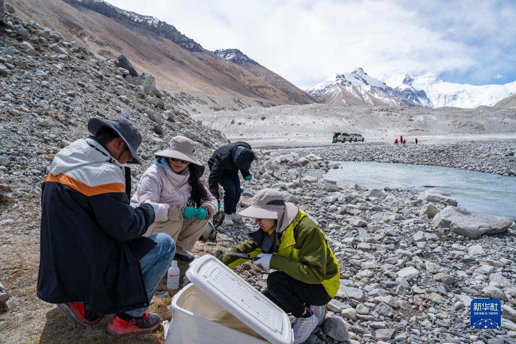 在珠峰登山大本營附近,來自西藏大學(xué)生態(tài)環(huán)境學(xué)院的科考隊(duì)員在采集水生生物樣本(5月22日攝)。新華社記者 孫非 攝