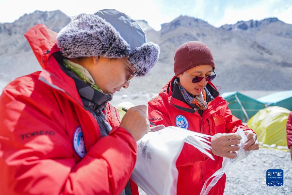 在珠峰登山大本營,中國科學(xué)院西雙版納熱帶植物園研究員蘇濤(右)和同事在樣品自封袋上做標(biāo)記(5月14日攝)。新華社記者 孫非 攝