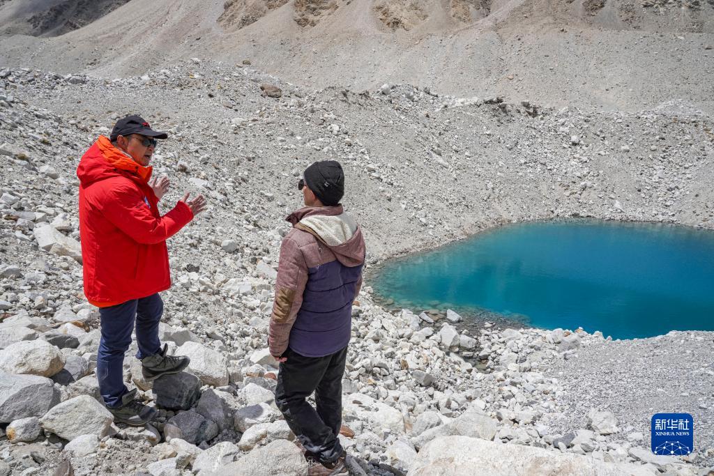 在珠峰海拔約5300米處,中國科學(xué)院西北生態(tài)環(huán)境資源研究院副院長康世昌(左)和科考隊(duì)員討論冰面湖的形成原因(5月14日攝)。新華社記者 孫非 攝