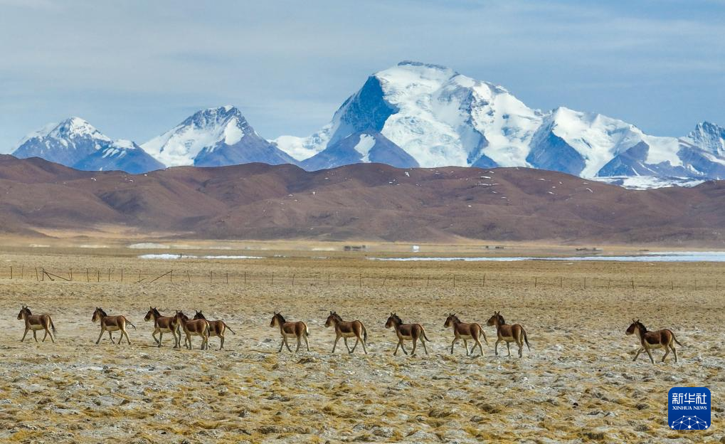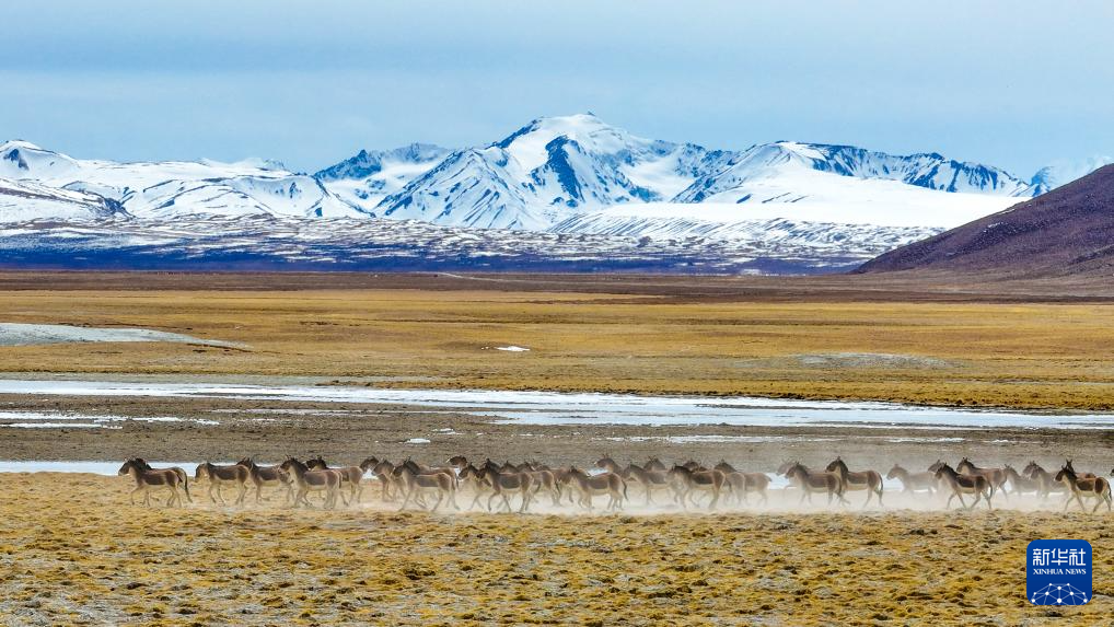 3月29日,藏野驢在西藏阿里地區(qū)普蘭縣境內(nèi)雪山下奔跑(無人機照片)。新華社發(fā)(劉曉東攝)