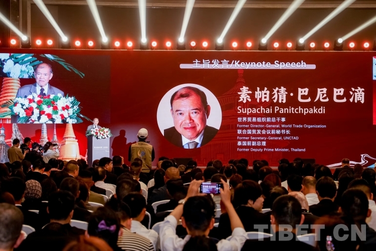 圖為世界貿(mào)易組織前總干事素帕猜·巴尼巴滴在活動現(xiàn)場。