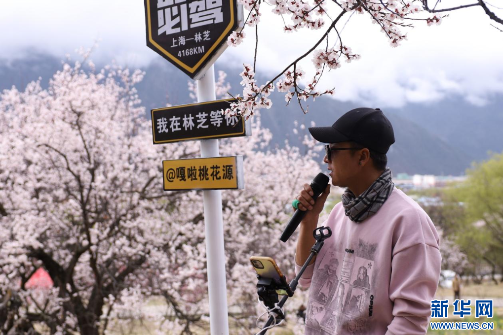 3月31日,游客在林芝市巴宜區(qū)嘎拉村進(jìn)行線上直播。新華網(wǎng)發(fā) 李騰 攝