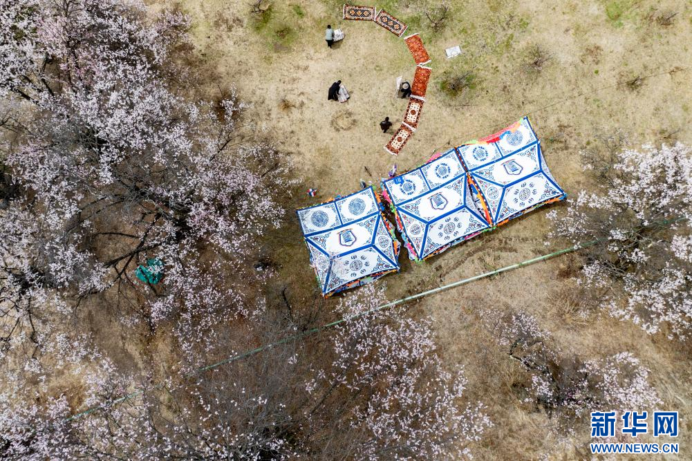 4月3日,群眾在林芝市巴宜區(qū)嘎拉村桃花間準(zhǔn)備 “過(guò)林卡”(無(wú)人機(jī)照片)。新華網(wǎng) 旦增努布 攝