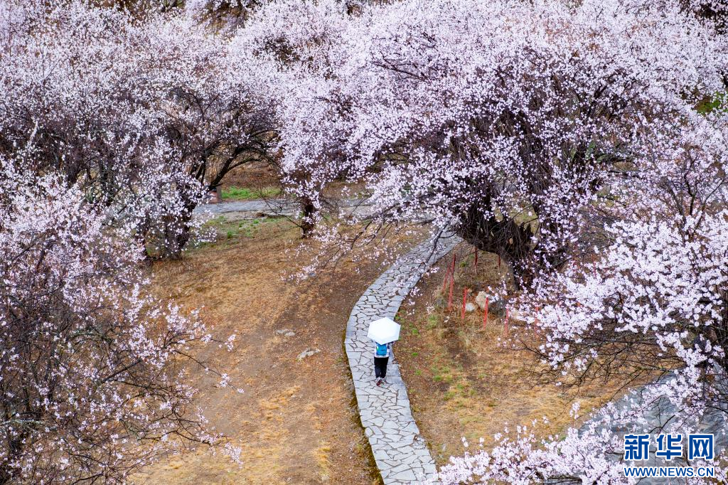 4月3日,游客在林芝市巴宜區(qū)嘎拉村賞桃花。新華網(wǎng) 旦增努布 攝