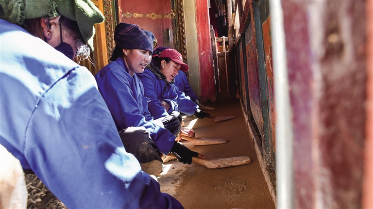 25載時(shí)光飛逝,從技藝生疏的新人,到泥匠組的負(fù)責(zé)人,貢覺旺姆與同事們保護(hù)、修復(fù)著布達(dá)拉宮的每一處屋頂、地坪與墻面?!拔覀兊墓ぷ髅刻煲c土打交道,每次看著布宮的一處處裂縫被修繕好,心底總有種自豪感?!必曈X旺姆說,“阿嘎”制成的屋頂具有特殊的韌性,即使下方支撐的木梁發(fā)生了斷裂,整個(gè)屋頂也不容易坍塌,是布宮最堅(jiān)固的一層鎧甲。