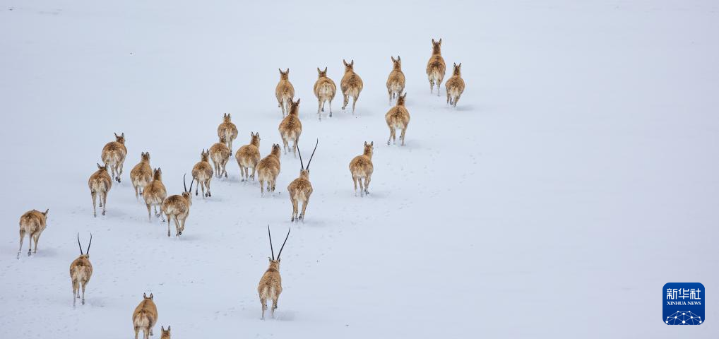藏羚羊在雪地上奔跑(5月8日攝)。新華社記者 姜帆 攝