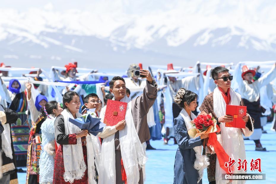 5月19日,隨著氣溫升高,西藏納木錯解凍開湖,迎接即將到來的旅游旺季。納木錯,藏語意為“天湖”。圖為納木措開湖儀式上舉辦集體藏式婚禮。