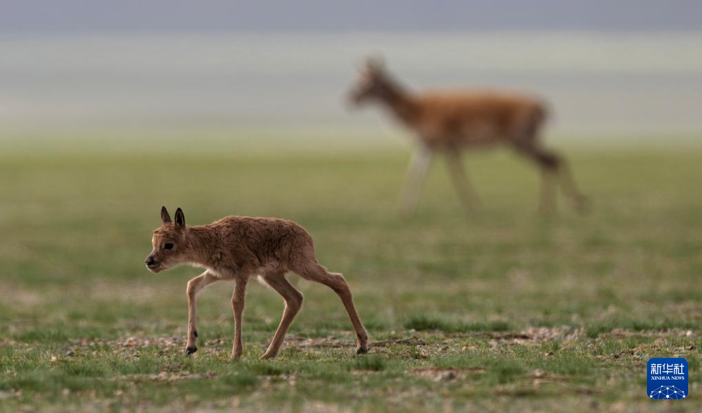 6月17日,在魯確塘草原,一只剛出生不久的小藏羚羊跟著母藏羚羊在草原上漫步。新華社記者 費(fèi)茂華 攝