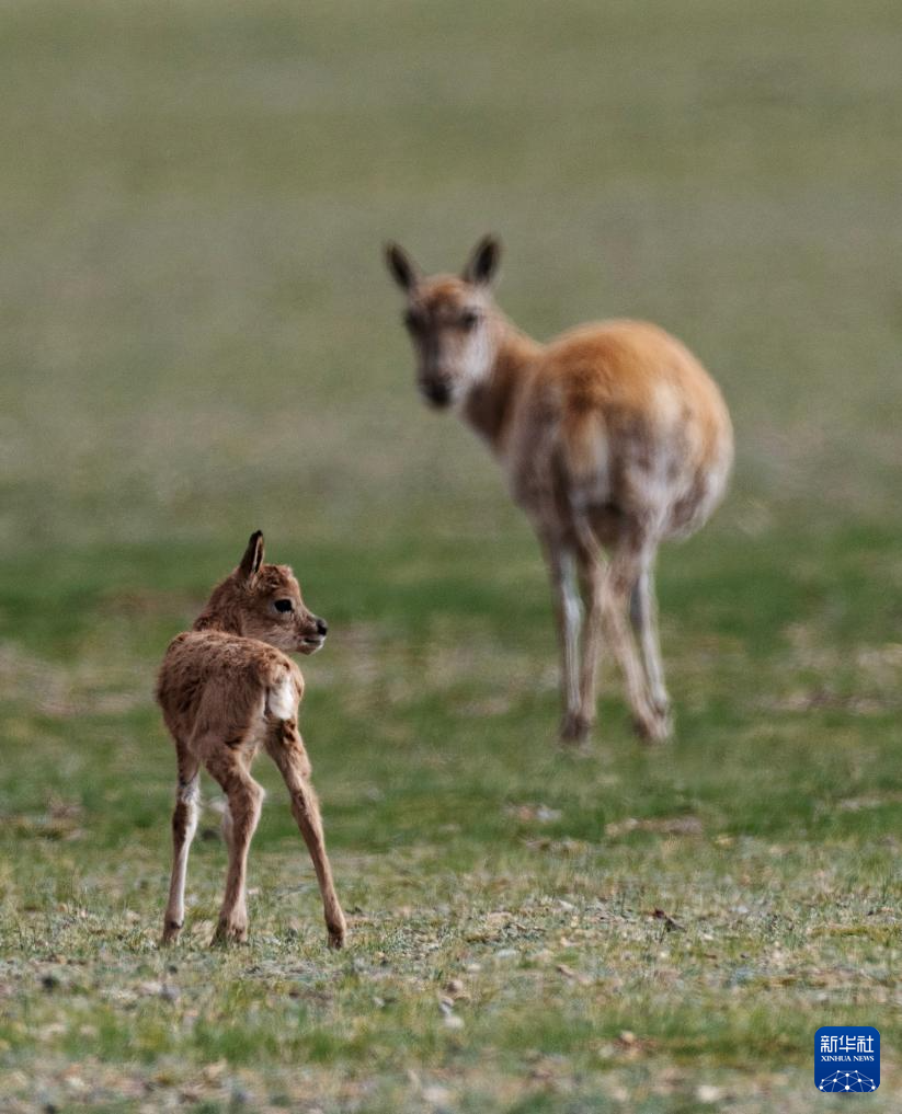 魯確塘草原上,藏羚羊媽媽守護(hù)著剛出生的小藏羚羊(6月16日攝)。新華社記者 旦增尼瑪曲珠 攝