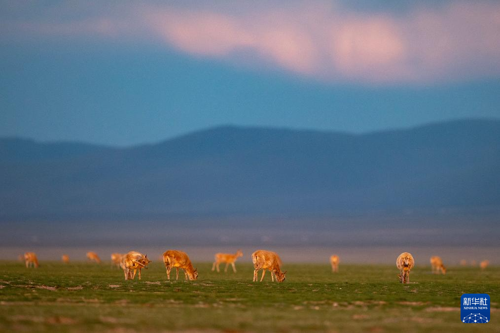 夕陽(yáng)下,母藏羚羊在魯確塘草原上活動(dòng)(6月16日攝)。新華社記者 晉美多吉 攝