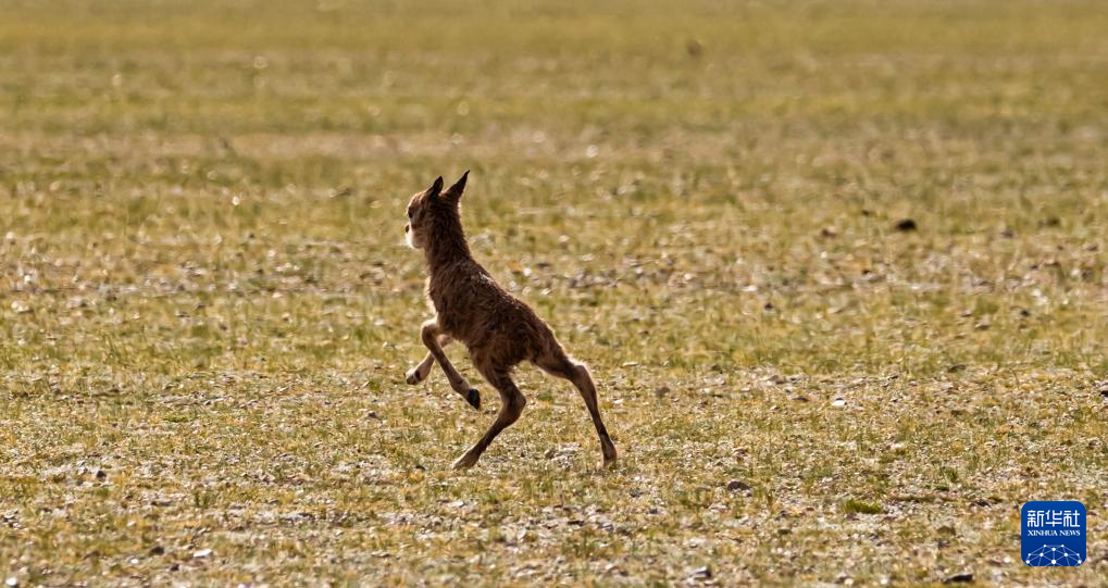 6月17日,在魯確塘草原,一只剛出生不久的小藏羚羊在草地上奔跑。新華社記者 費(fèi)茂華 攝??
