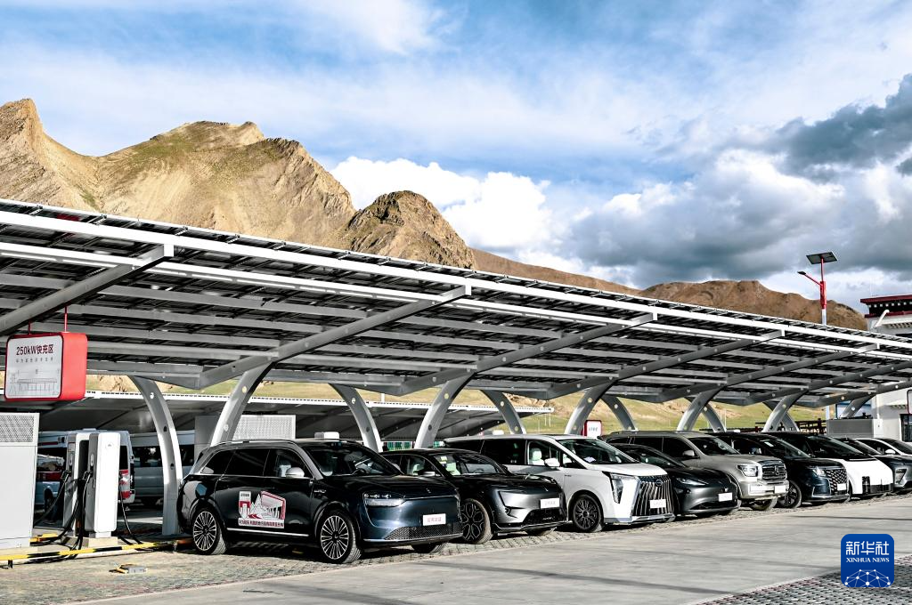 9月2日拍攝的日喀則市珠穆朗瑪國家公園北大門停車場內(nèi)的珠峰光儲(chǔ)液冷超充站。新華社發(fā) ??
