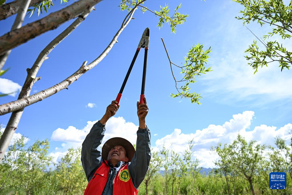 在雅江北岸南木林生態(tài)示范區(qū),當(dāng)?shù)刈o(hù)林員在修剪林木(2024年9月1日攝)。新華社記者 孫瑞博 攝 ??