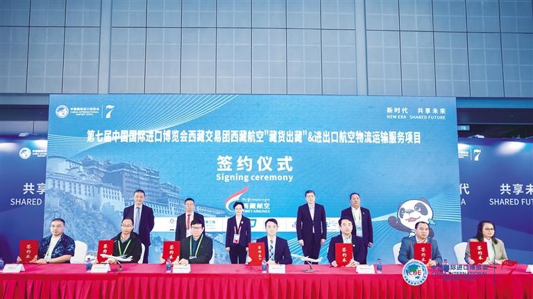 11月5日,備受矚目的第七屆中國國際進口博覽會在上海隆重開幕。西藏航空作為西藏自治區(qū)進博會交易團成員亮相此次進博會,并成功舉辦了“藏貨出藏”及進出口航空物流運輸服務(wù)項目的簽約儀式及推廣活動。本次活動得到了西藏自治區(qū)政府商務(wù)廳的大力支持。西藏航空黨委委員、副總經(jīng)理張兵兵出席簽約儀式。