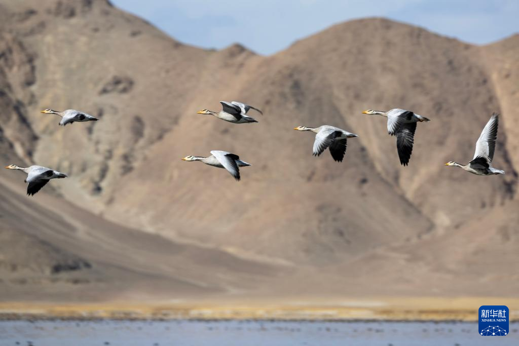 斑頭雁在班公湖上空飛翔(11月16日攝)。新華社記者 姜帆 攝  ??