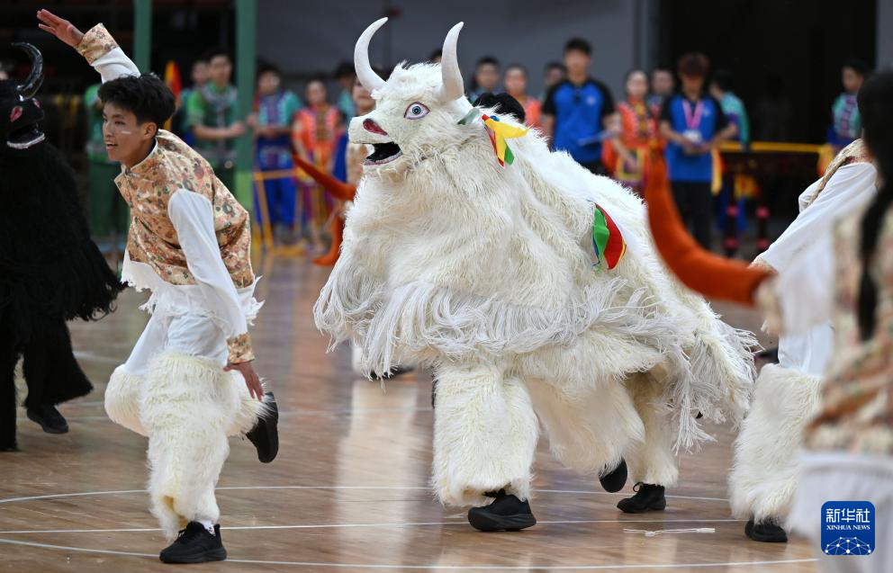 音樂響起,身著藏式服裝的孩子們與身披毛氈、扮演牦牛的孩子們沖進(jìn)場(chǎng)內(nèi),或跳起熱情奔放的舞蹈,或模仿著牦牛的動(dòng)作與形態(tài),時(shí)而奔騰,時(shí)而對(duì)峙,飽含力量的動(dòng)作與吶喊呈現(xiàn)著來(lái)自雪域高原的勇猛與堅(jiān)韌,展現(xiàn)人與自然和諧共處的生動(dòng)景象,也讓體育館內(nèi)每一位觀眾都能感受到他們對(duì)民族傳統(tǒng)體育文化的熱愛與自豪。