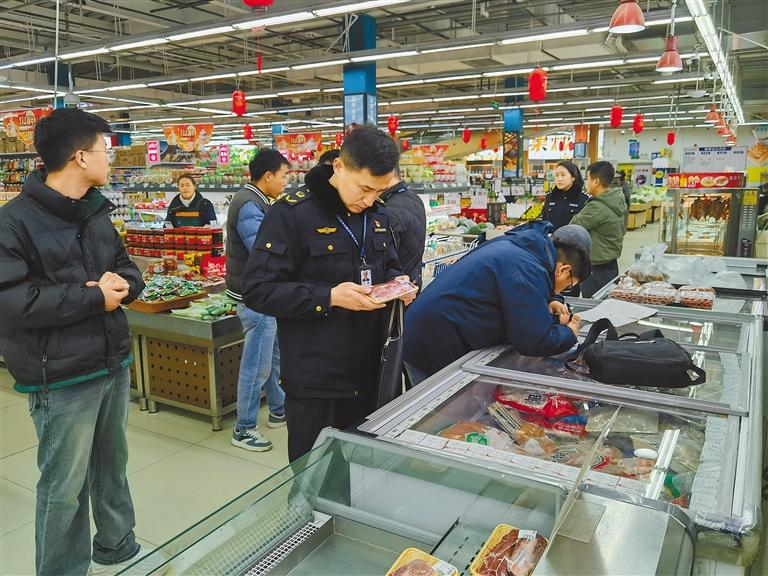 圖為執(zhí)法人員在商超開(kāi)展肉制品檢查。記者 央金 攝